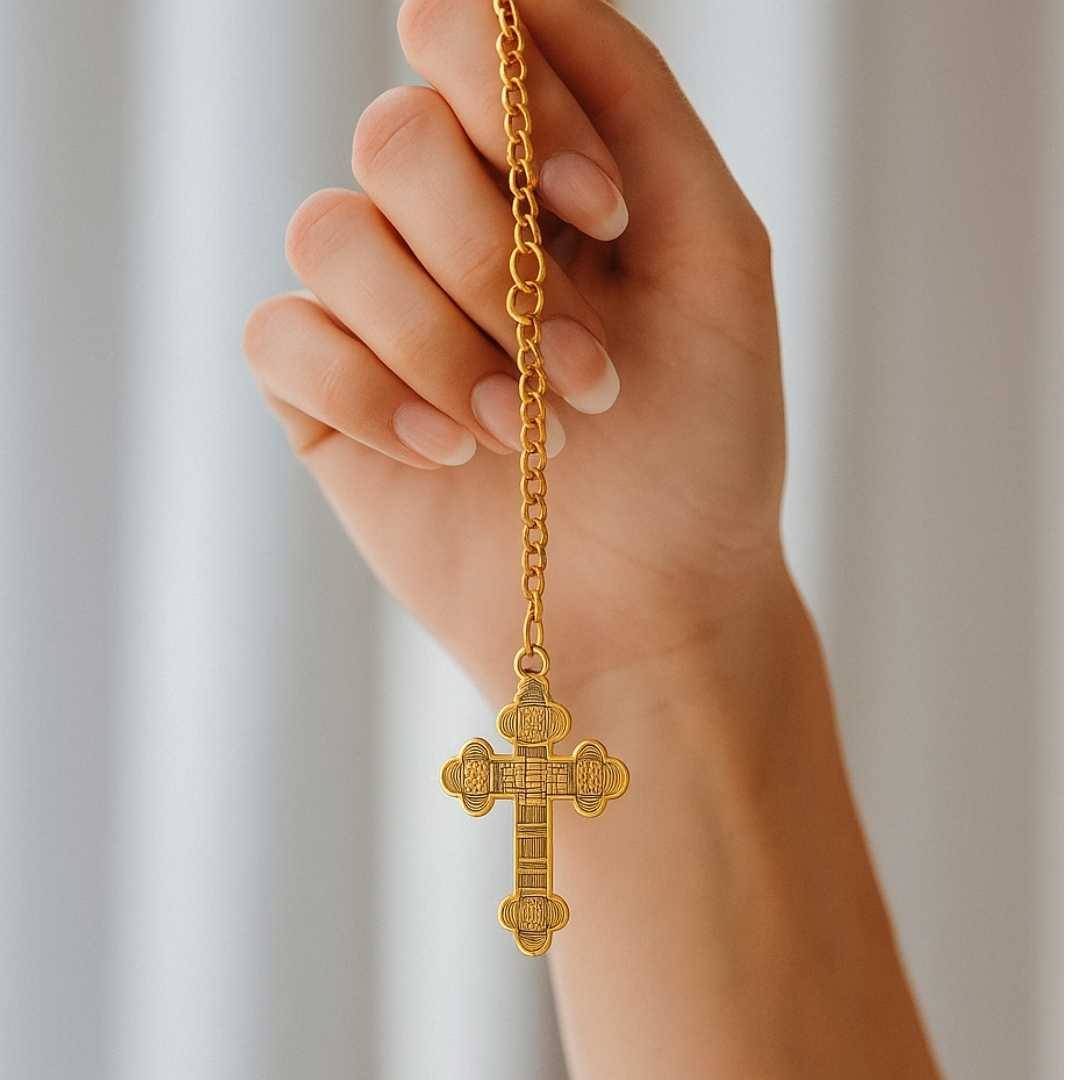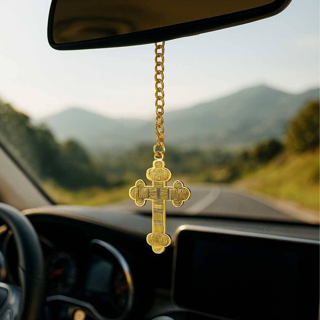 Elita Decorative Gold Cross Car Rear View Mirror Hanging Ornament, Gold-Plated Finish in Brass