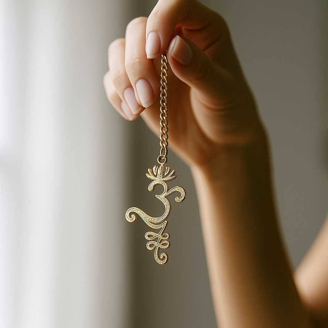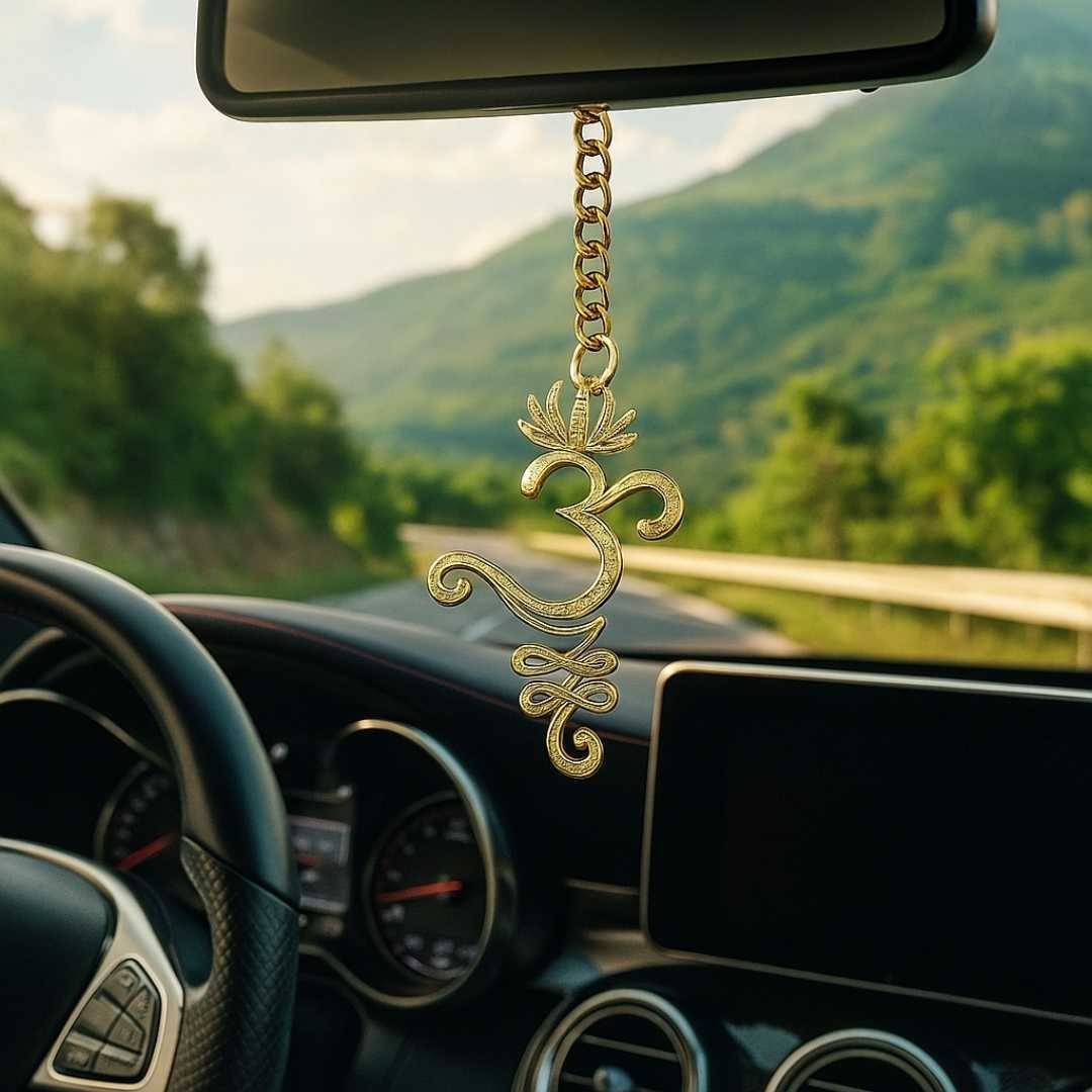 Elita Om Symbol Car Rear View Mirror Hanging Charm, Gold-Tone Chain, Gold-Plated Finish in Brass