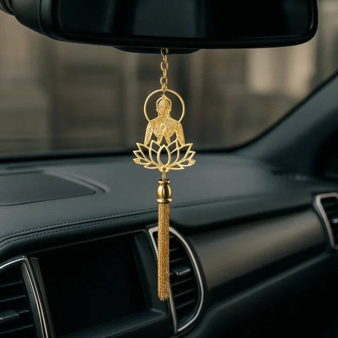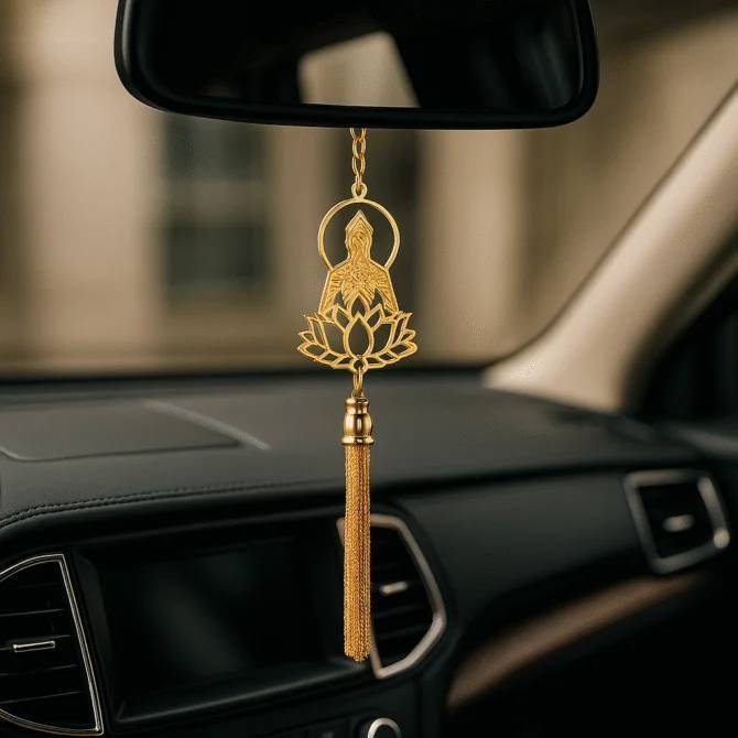 Elita Buddha Car Rearview Mirror Hanging Charm, Gold-Tone Chain, Decorative Car Accessory