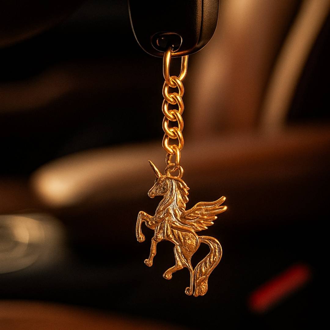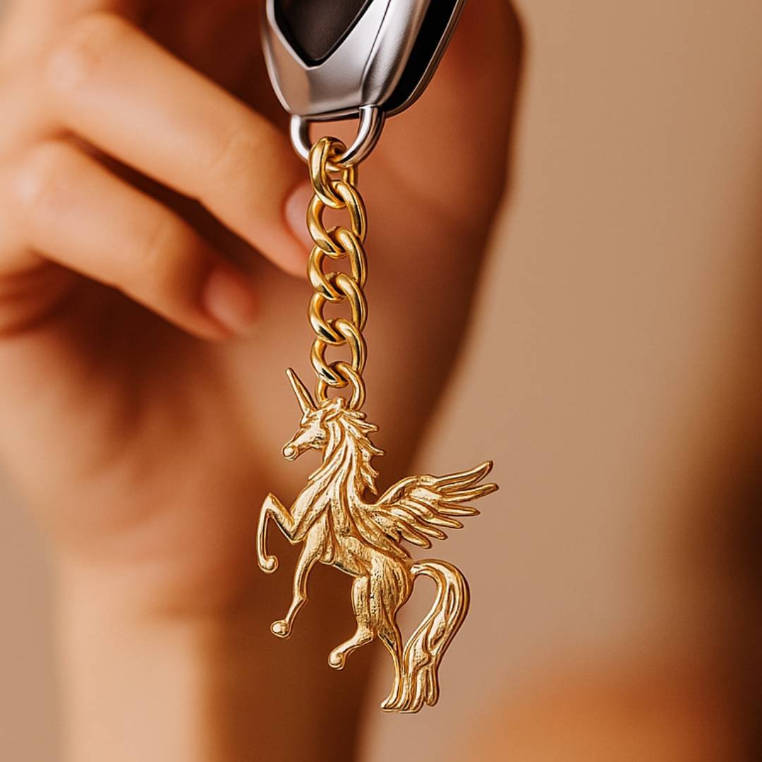 Elita Gold-Plated Finish Brass Unicorn Keychain, Winged Mythical Horse Design, Decorative Chain Link